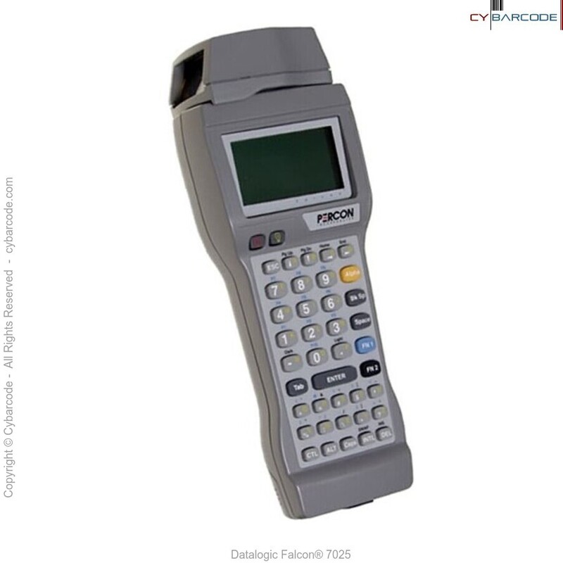 The PSC Percon Falcon 7025 features 32-bit 386 open architecture, DOS 6.22, and an easily accessible PC card slot in a lightweight, ergonomic, easy-to-use, and compact design.They include an 8 x 21 back lit graphics display, a large 41-key keypad and an RS-232 serial port.