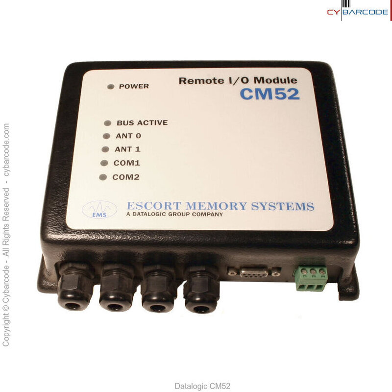 The EMS - Datalogic - CM52 is a general purpose programmable module provides as an interface between Allen-Bradley Remote I/O Networks and up to two HS500 -Series Active RFID Antennas or as many as 32 HMS -Series Reader/Writers and even bar code scanners on a MUX32 line. The CM52 can be used to give a Remote I/O presence to a wide range of existing equipment, such as bar code readers, RFID Controllers, bar code verifiers, sensors and switches