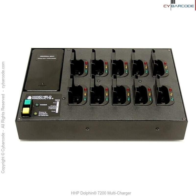 The HHP Dolphin® 7200 MultiCharger is a battery charger for Dolphin handheld computers. It completes 100 percent charge for 10 NiMH (Nickel Metal Hydride) Dolphin handheld computer batteries in three hours. Charging slots work independently to control charging and discharging of individual battery packs. The MultiCharger is compatible with all models in the Dolphin® 7200 family of handheld computers.