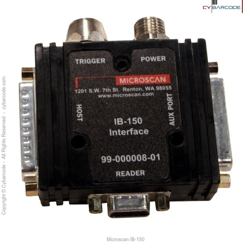 The Microscan IB-150 interface simplifies connectivity by linking the barcode reader to the host, power supply, trigger, and aux port connections. In addition to multidrop and daisy chain hookups, the aux port can plug into the IB-152 interface for terminal strip wiring.