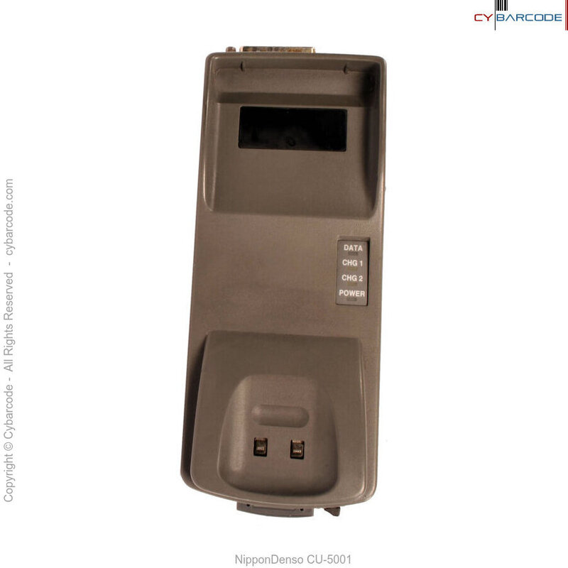 The Denso CU-5001 optical-communication base unit with charging capability.Recharging is possible by placing the handy terminal on the CU-5001. A spare nickel-hydrogen battery is recharged by placing in the appropriate slot.
