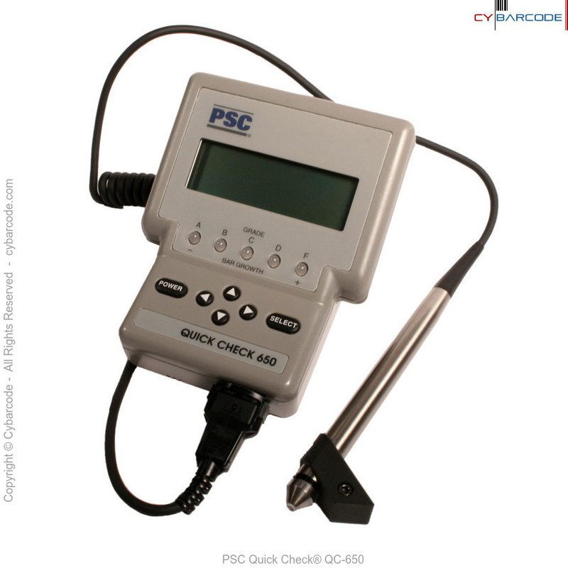 The PSC QC650 verifier analyzes bar code print quality guidelines. The QC-650 includes all standard symbologies and is manufactured and traceable to NIST (National Institute of Standards and Technology) standards developed by the UCC (Uniform Code Council) and AIM (Automatic Identification Manufacturers).