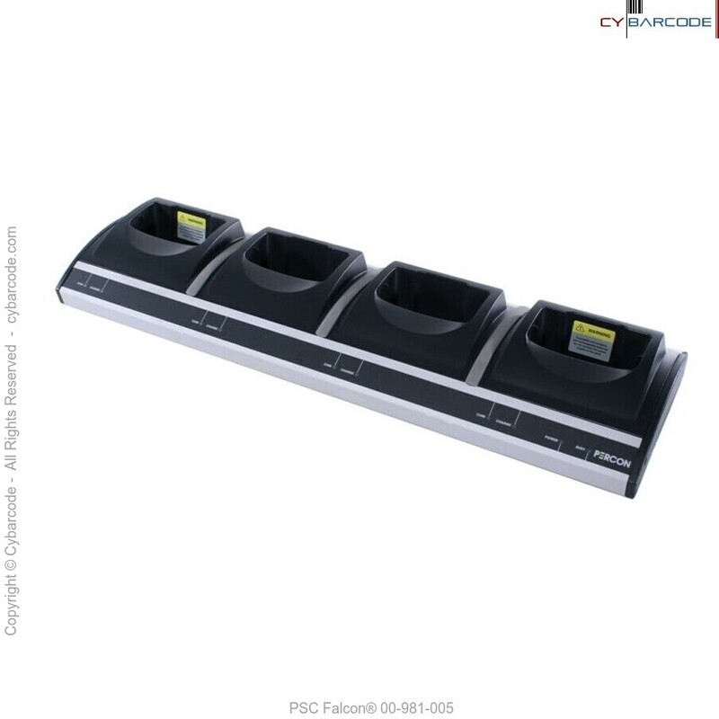 The PSC Percon Falcon 4-Slot Cradle enables up to 4 Falcon terminals to communicate with their associated host computers connected to a host.