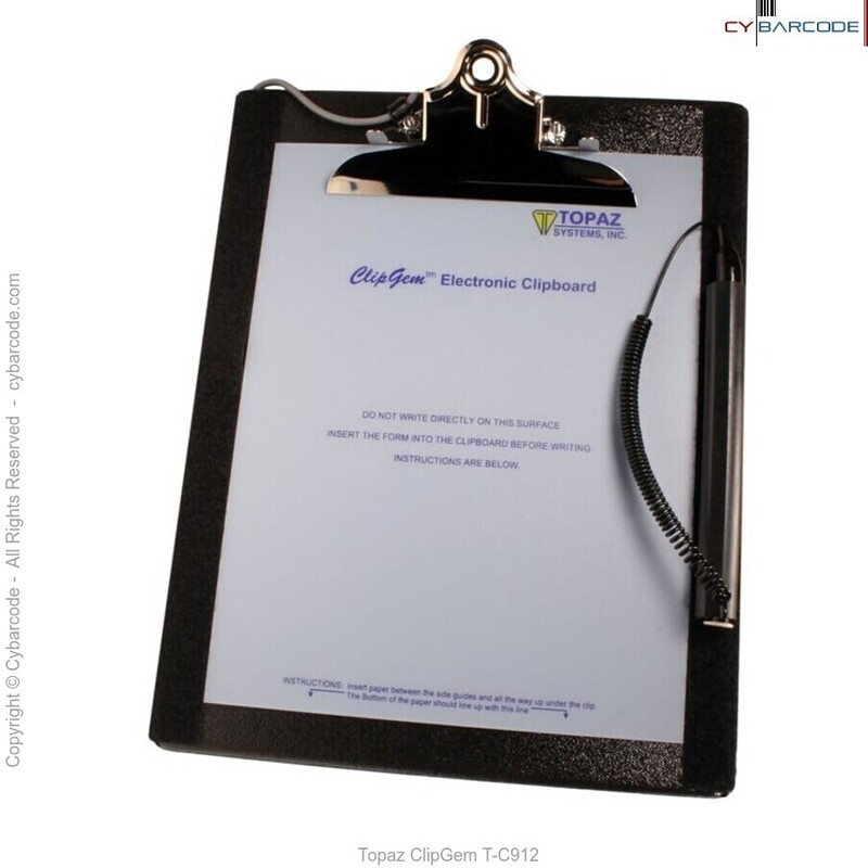 Topaz ClipGem is an electronic clipboard and signature capture pad that supports simultaneous electronic and ink-on-paper recording of signatures.