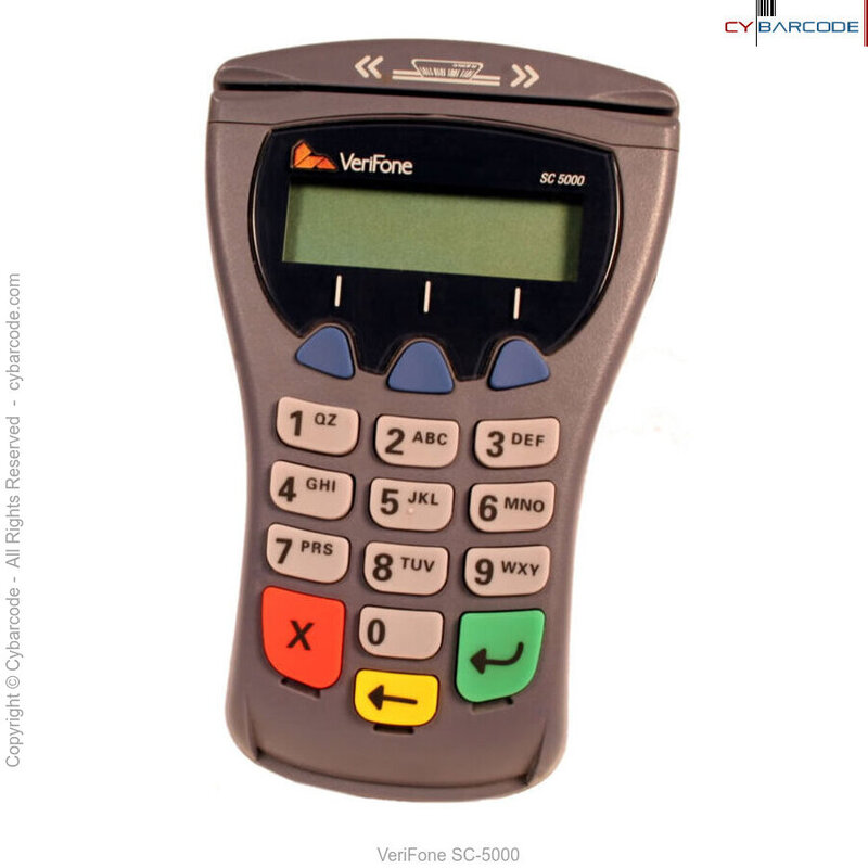 The VeriFone SC 5000 Series PINpad unit is a PIN pad with an integrated smart card reader for connection to either VeriFone transaction terminals or third party electronic point of sale systems, offering advanced security and smart card processing capabilities.
